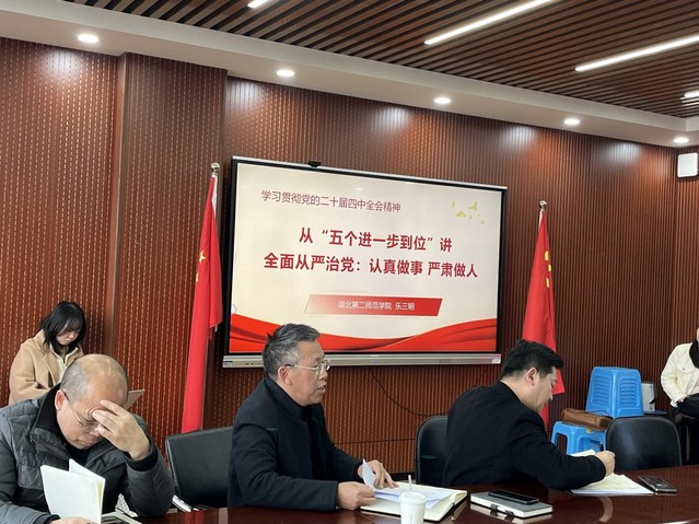 在专题系列学习环节,孙利带领党员集中学习以下内容:1.习近平总书记重要讲话和重要指示精神。2.党的二十届四中全会相关精神。3.中央八项规定精神等违纪情况通报。4.2025年度领导干部学法计划。5.《湖北第二师范学院党支部主题党日工作指引》文件精神。