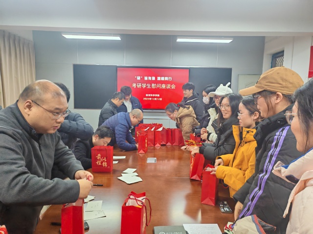 随后,乐三明书记、张炜院长等领导班子成员给考研学生送上亲笔签名的祝福贺卡,并给每位同学送上了一份精心准备的“暖心慰问礼包”,里面承载着学院全体师生对考研学子们最深切的美好祝愿。同学们接过这份暖意浓浓的礼物,脸上洋溢着感动与振奋的笑容。