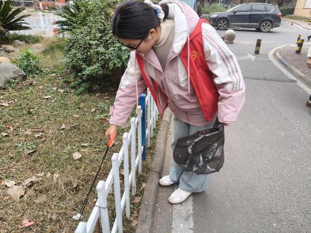 另一组志愿者则深入社区道路与绿化区域展开清理。他们不仅清扫路面上的落叶与显见垃圾,更俯身探入绿化带内部,用垃圾夹仔细搜寻、捡拾隐匿的塑料包装、烟头等陈积杂物,力求实现细致、周到的清洁。