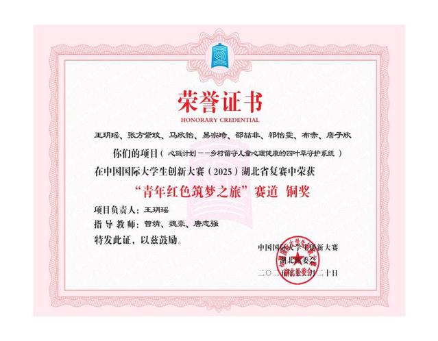 (通讯员 郭希、康佳琪)在2025年度中国国际大学生创新大赛湖北省复赛中,我院曾婧、陈梦等老师指导的《心链计划——乡村留守儿童心理健康的四叶草守护系统 》《 和家智导——家庭教育指导服务》项目荣获省级铜奖,共计2项。