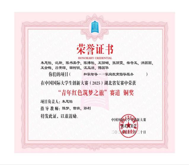 (通讯员 郭希、康佳琪)在2025年度中国国际大学生创新大赛湖北省复赛中,我院曾婧、陈梦等老师指导的《心链计划——乡村留守儿童心理健康的四叶草守护系统 》《 和家智导——家庭教育指导服务》项目荣获省级铜奖,共计2项。