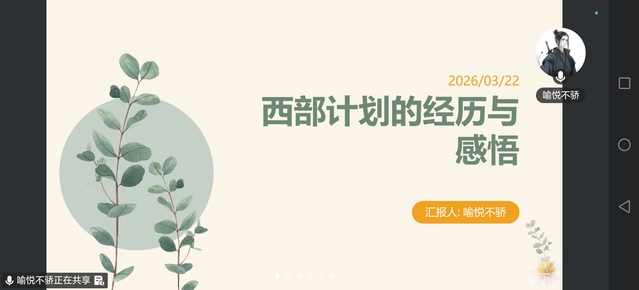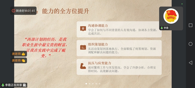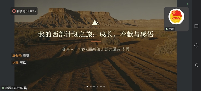 在经验分享环节,喻悦不骄学长和李霞学姐,先后分享了从报名到录取注意事项,分享了自己在基层服务的故事,从最开始的满怀憧憬与忐忑,到奔赴岗位后直面基层的真实挑战、适应艰苦的工作环境,再到扎根服务、用所学奉献基层、收获成长与感动,学长学姐们用亲身经历讲述了西部计划的初心与坚守,分享了在基层服务中的所见所闻、所思所悟,他们用一个个鲜活的事例、一段段真挚的讲述,让大家感受到了青年一代的责任与担当,也让大家对西部计划、对基层服务有了更真切、更全面的认知,在心中种下了投身基层、服务社会的青春种子。