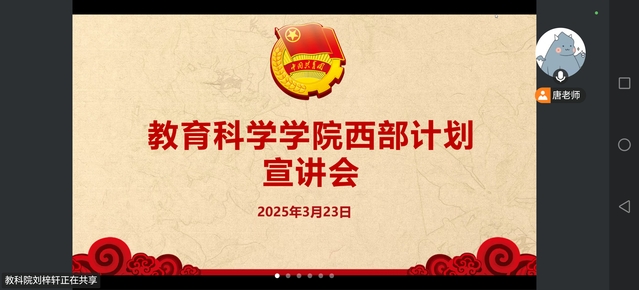 (通讯员胡诗睿)为切实做好2026年大学生志愿服务西部计划志愿者招募工作,3月23日晚上20:30,教育科学学院(以下简称“教科院”)在腾讯会议上召开西部计划宣讲会,唐志强老师、西部计划志愿者喻悦不骄、李霞以及26届毕业班学生参会。