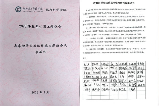 此次主题班会通过政策解读、案例警示、经验分享和承诺签署等环节,将感恩励志、诚信教育与安全防范有机结合,有效提升了受助学生的风险识别能力和诚信感恩意识。教育科学学院将持续开展此类专题教育,助力学生健康成长与全面发展。